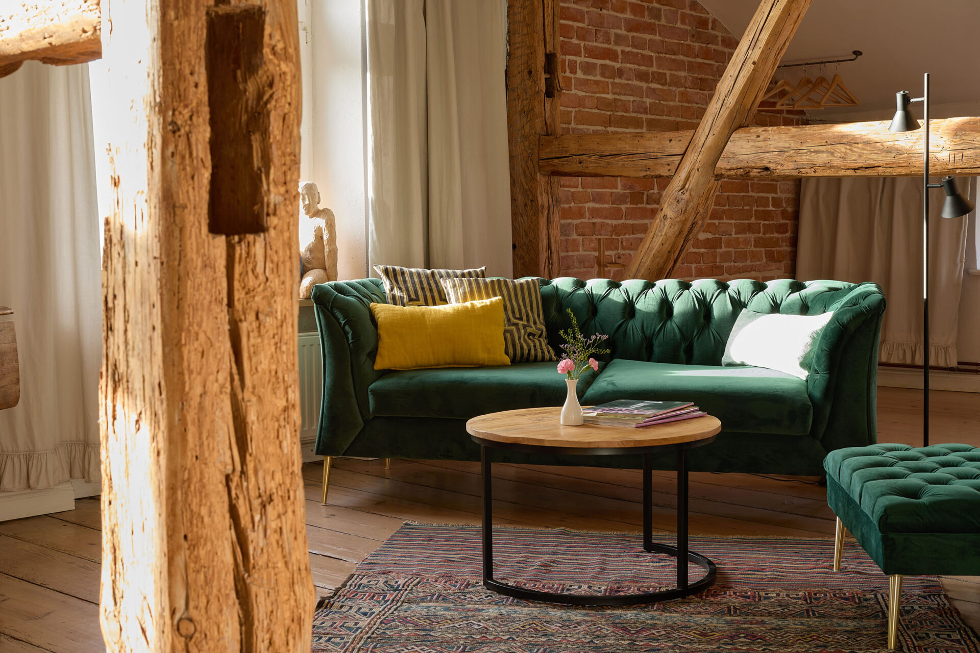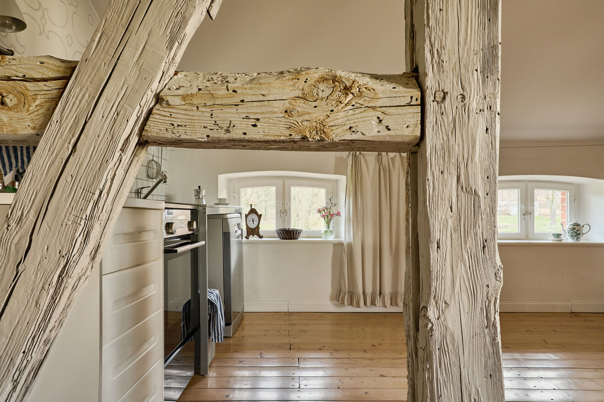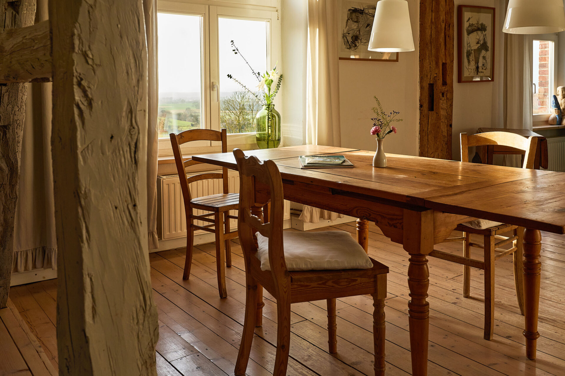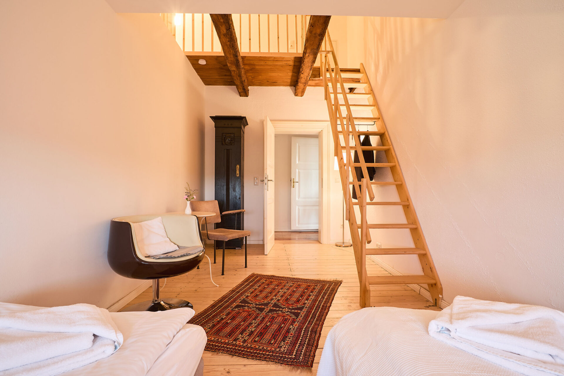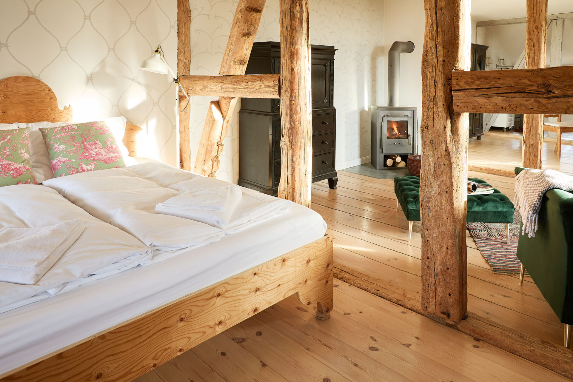 Bertha90 m² Apartment, 2 Zimmer, Wohnküche, 4 Personen, 1 Doppelbett, 2 Einzelbetten, Kaminofen, Badewanne und Dusche, offene Fachwerkelemente, Hochebene, Fernseher und WLAN, KunstGrundriss:Wohnung für 4 Personen, Aufbettung mit Aufpreis möglich. Bertha Wohnzimmer Blick von oben aufs kleinere Zimmer Die Jungs in Bertha Blick auf Schreibtisch