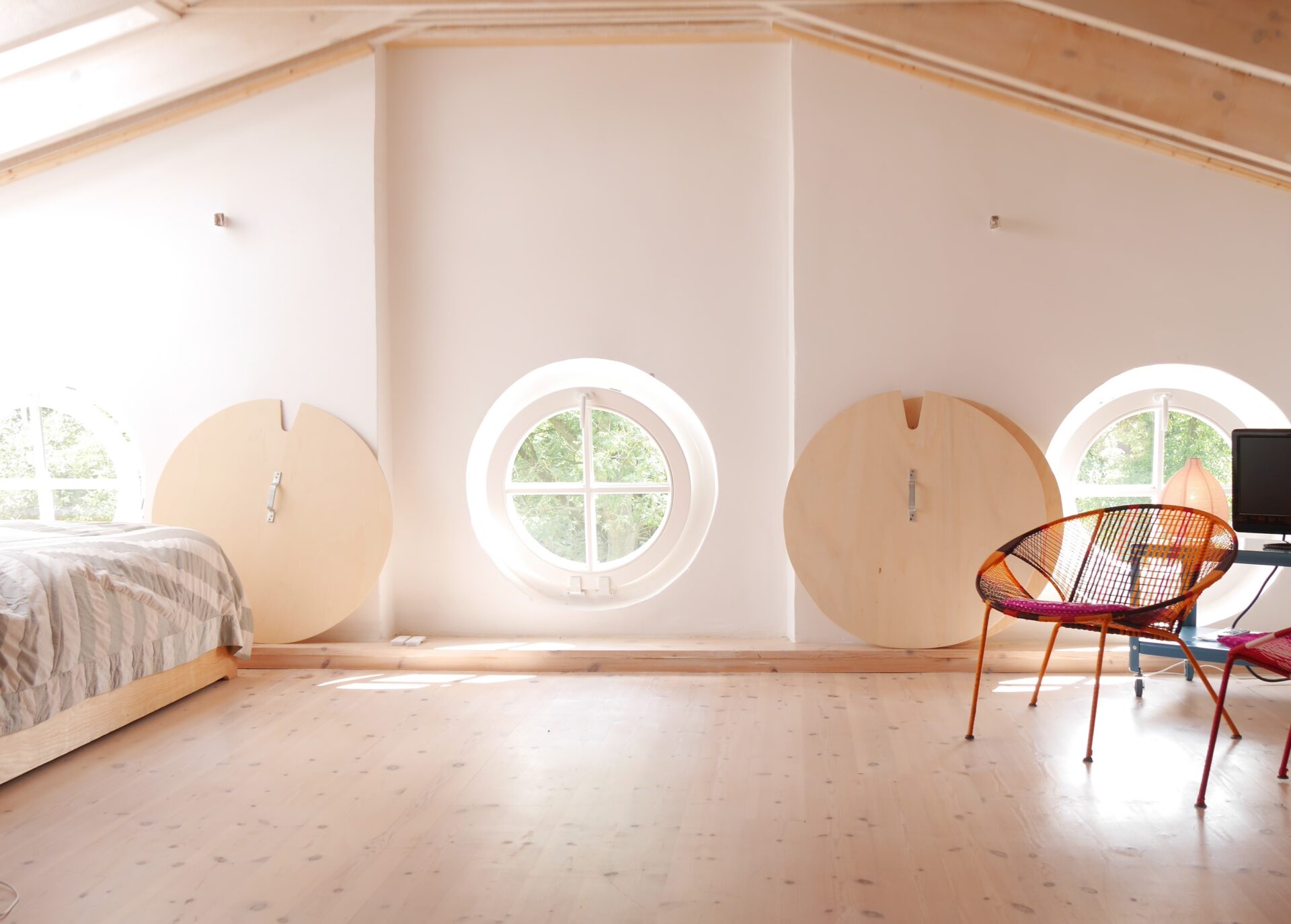Die Ferienwohnung Clara befindet sich im Dachgeschoss des Gutshauses. Es ist ein 60 m² Loft mit Wohnküche für 3 Personen. Es hat: 1 Doppelbett, 1 Einzelbett, Bad mit Sitzbadewanne, 6 Rundfenster und 7 Dachfenster, sichtbare Dachbalken, TV, WLAN, Blick zum Garten und über die Felder.