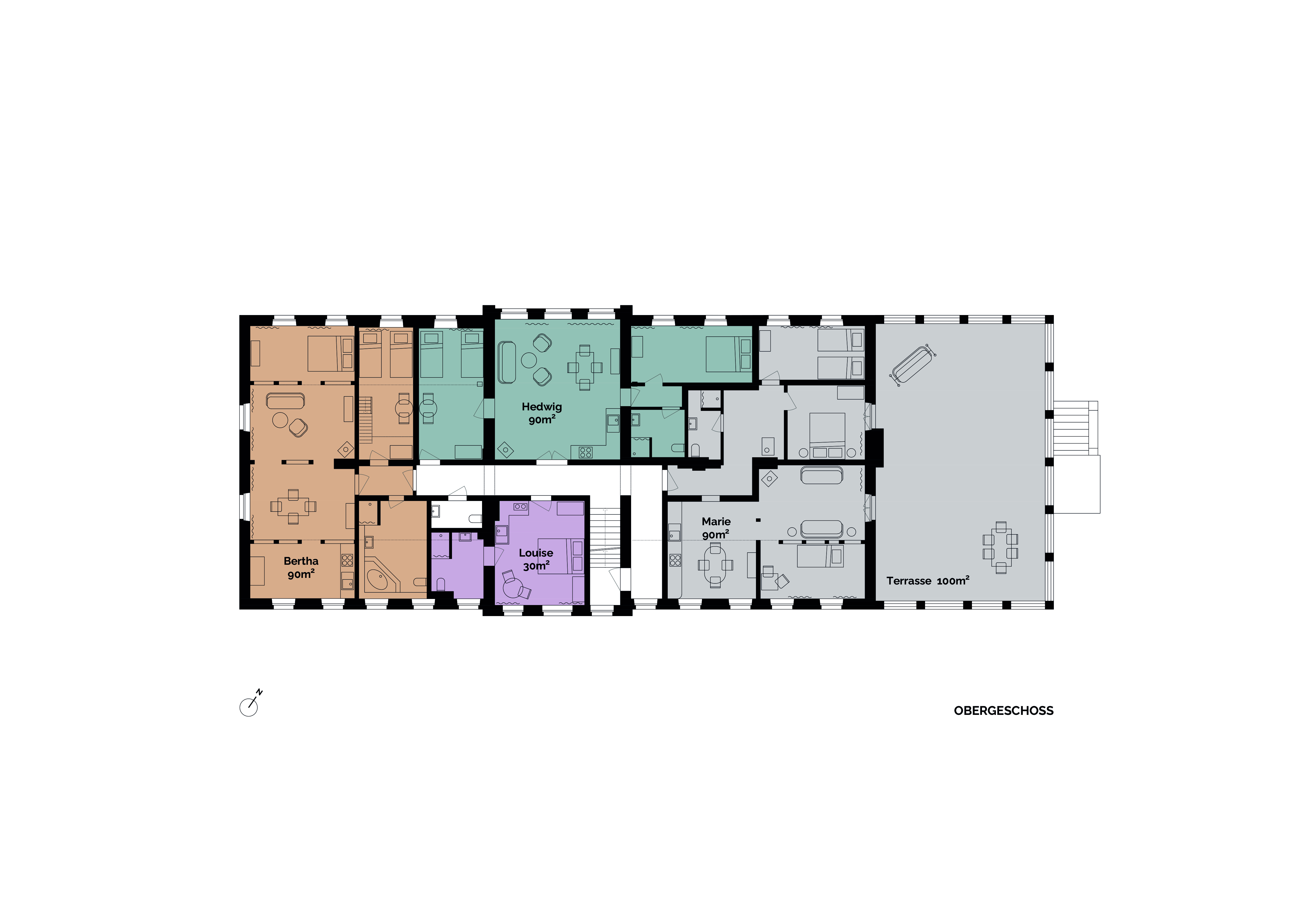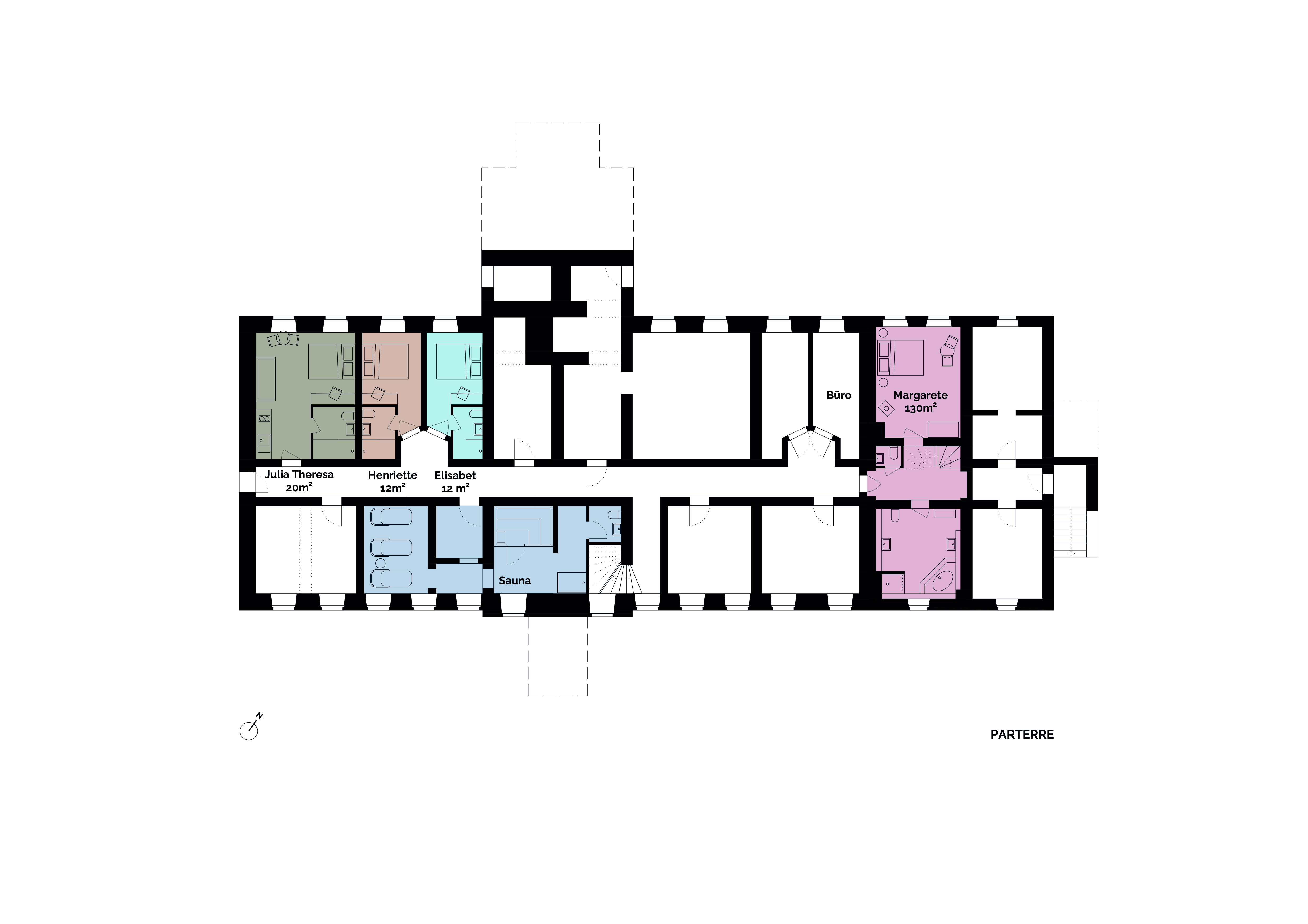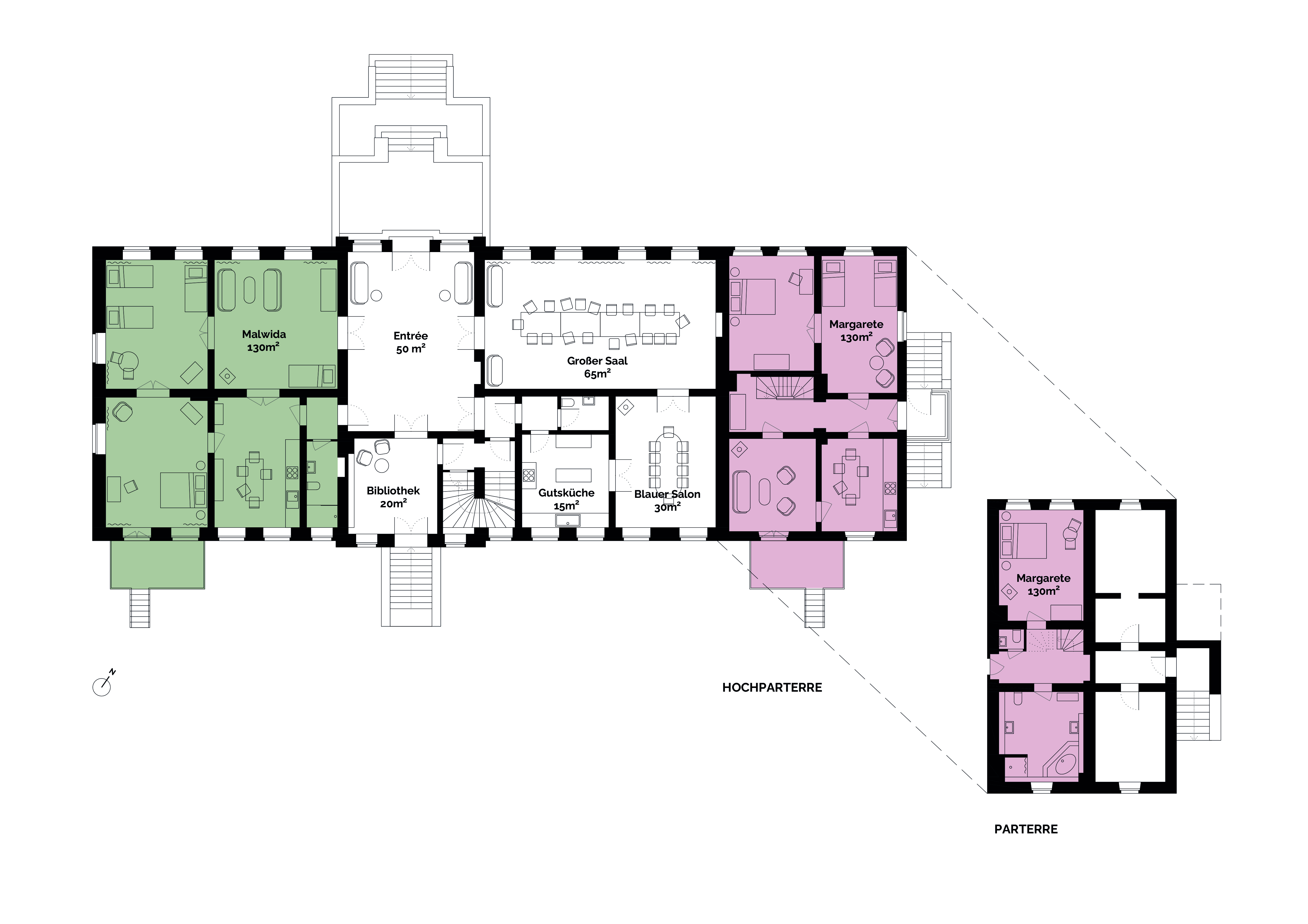 Das Gutshaus beherbergt 8 individuell eingerichtete Apartments von 25 bis 130 m2 sowie 2 stilvolle Hotelzimmer. In allen Räumen verbindet sich historisches Ambiente mit modernem Komfort. Übrigens tragen alle Apartments Namen bemerkenswerter Frauen, die die Gesellschaft im 19. Jahrhundert geprägt haben.