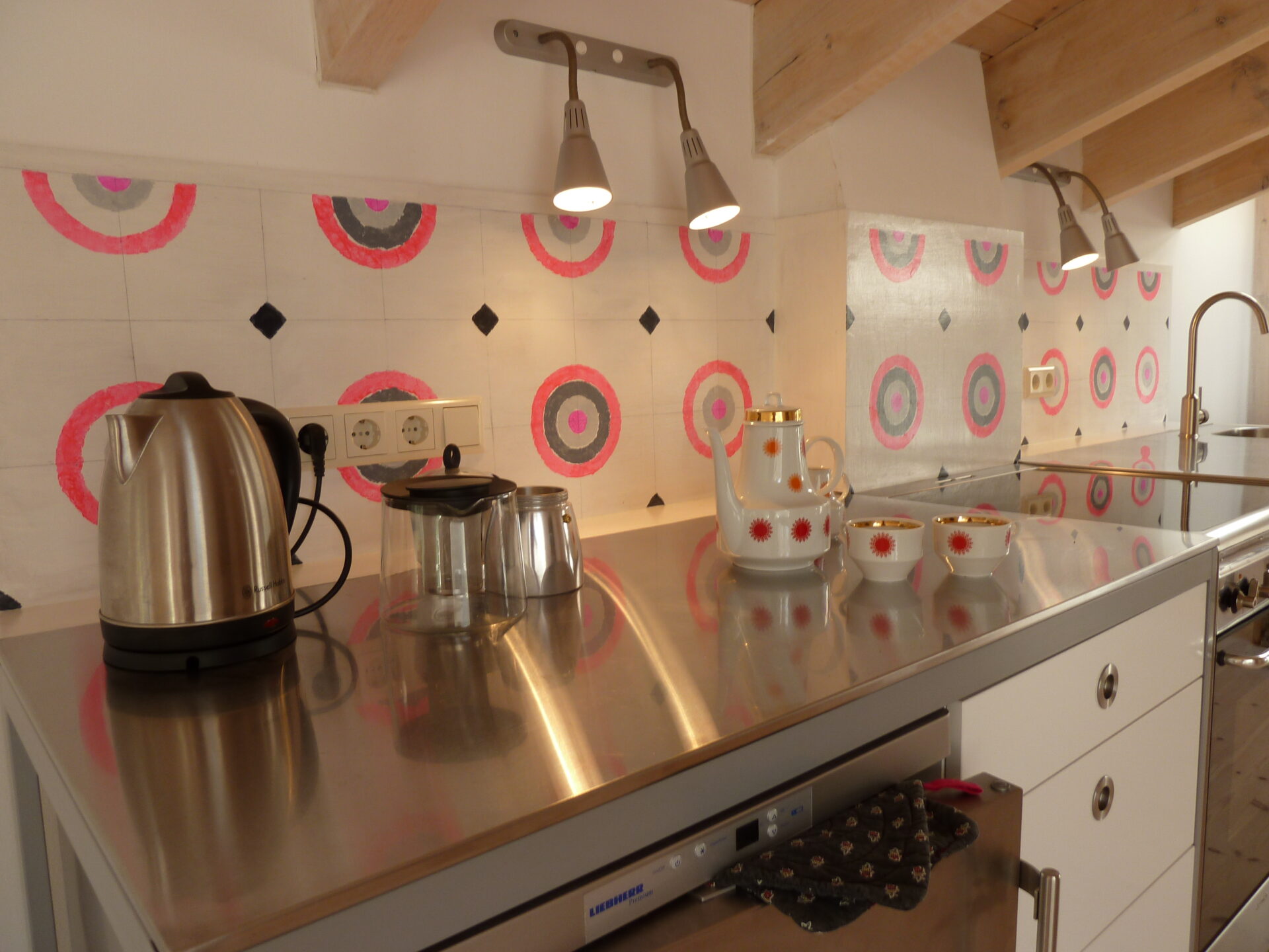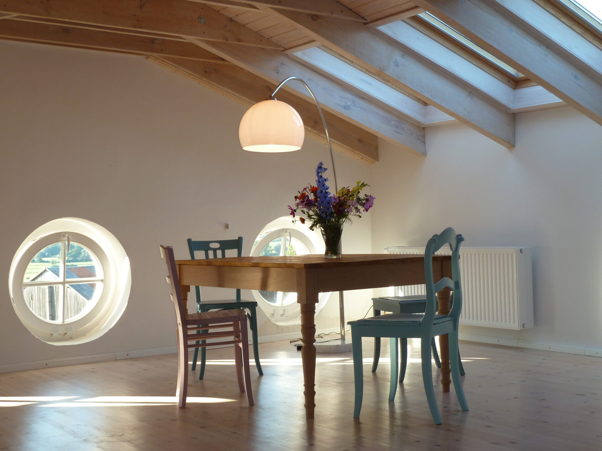 The approx. 60 m² large apartment is located on the top floor of the middle section of the house. The apartment features visible, whitewashed roof beams, many large skylights and six round ground-level windows on the gable sides lending a generous loft-like ambience. Enjoy the starry night skies thanks to the skylights (which also have shades). The loft has a kitchenette with a stove and dishwasher as well as a small bathroom with a small bathtub.