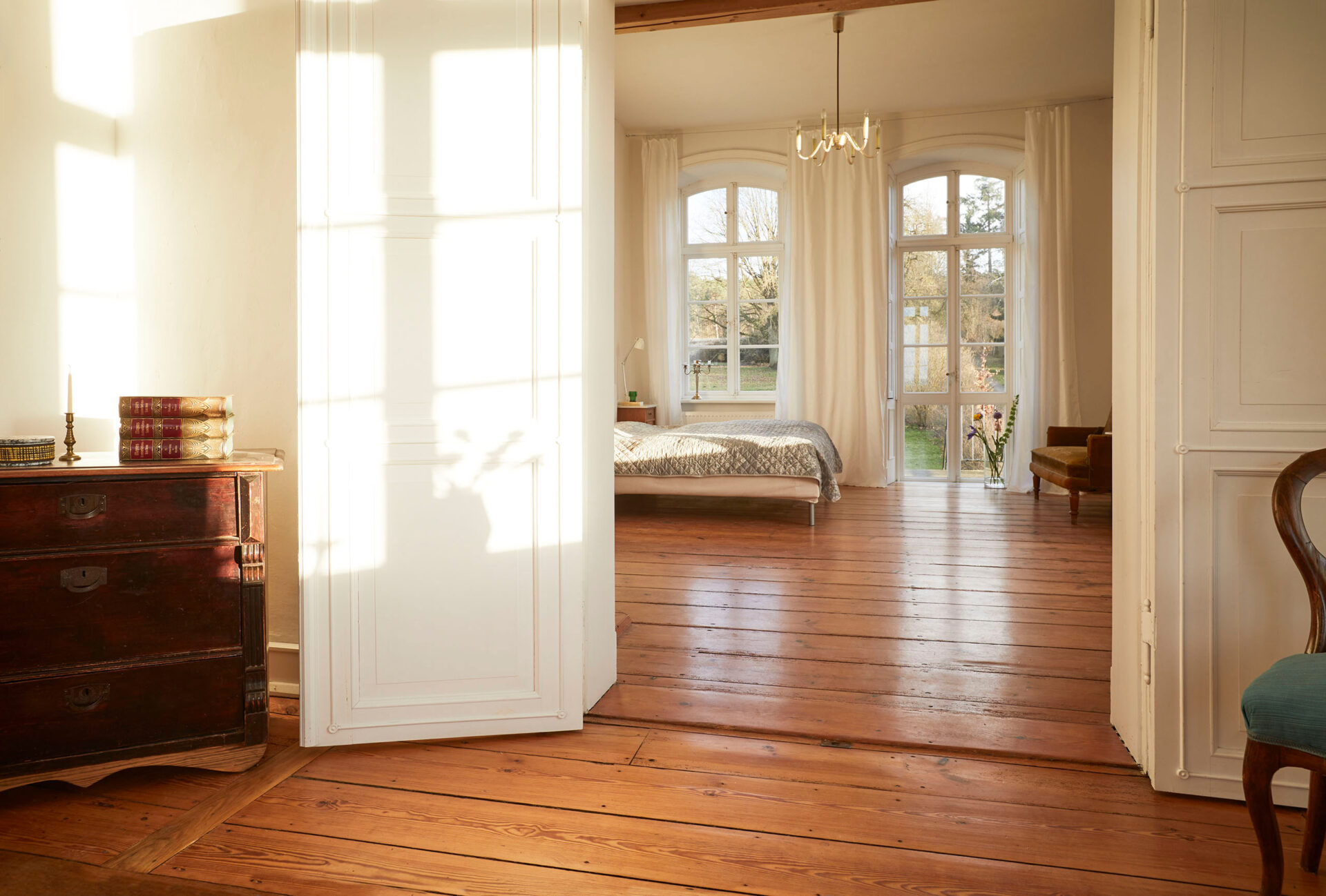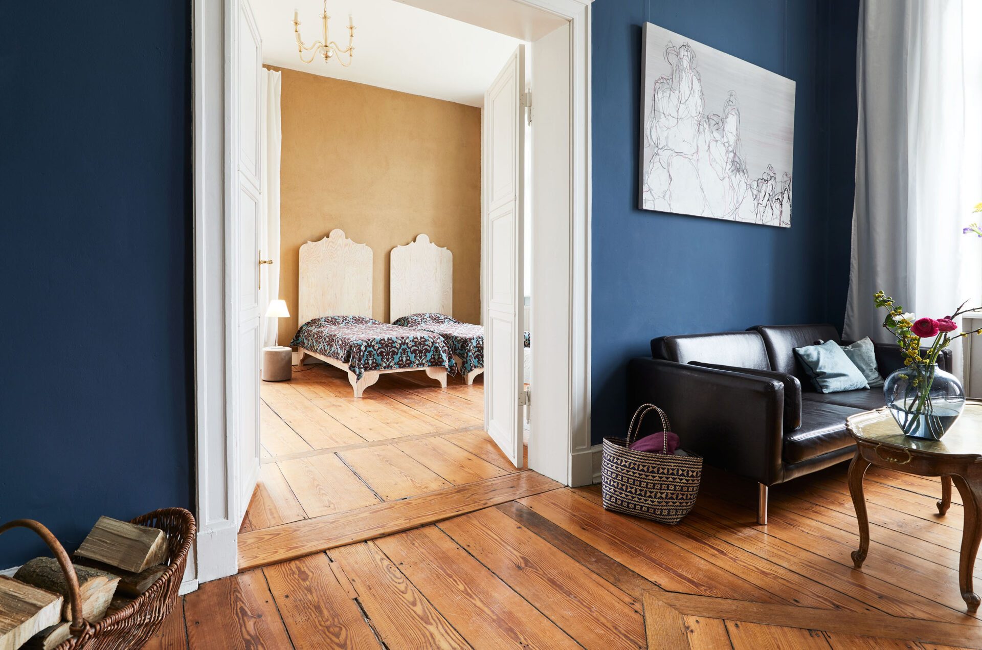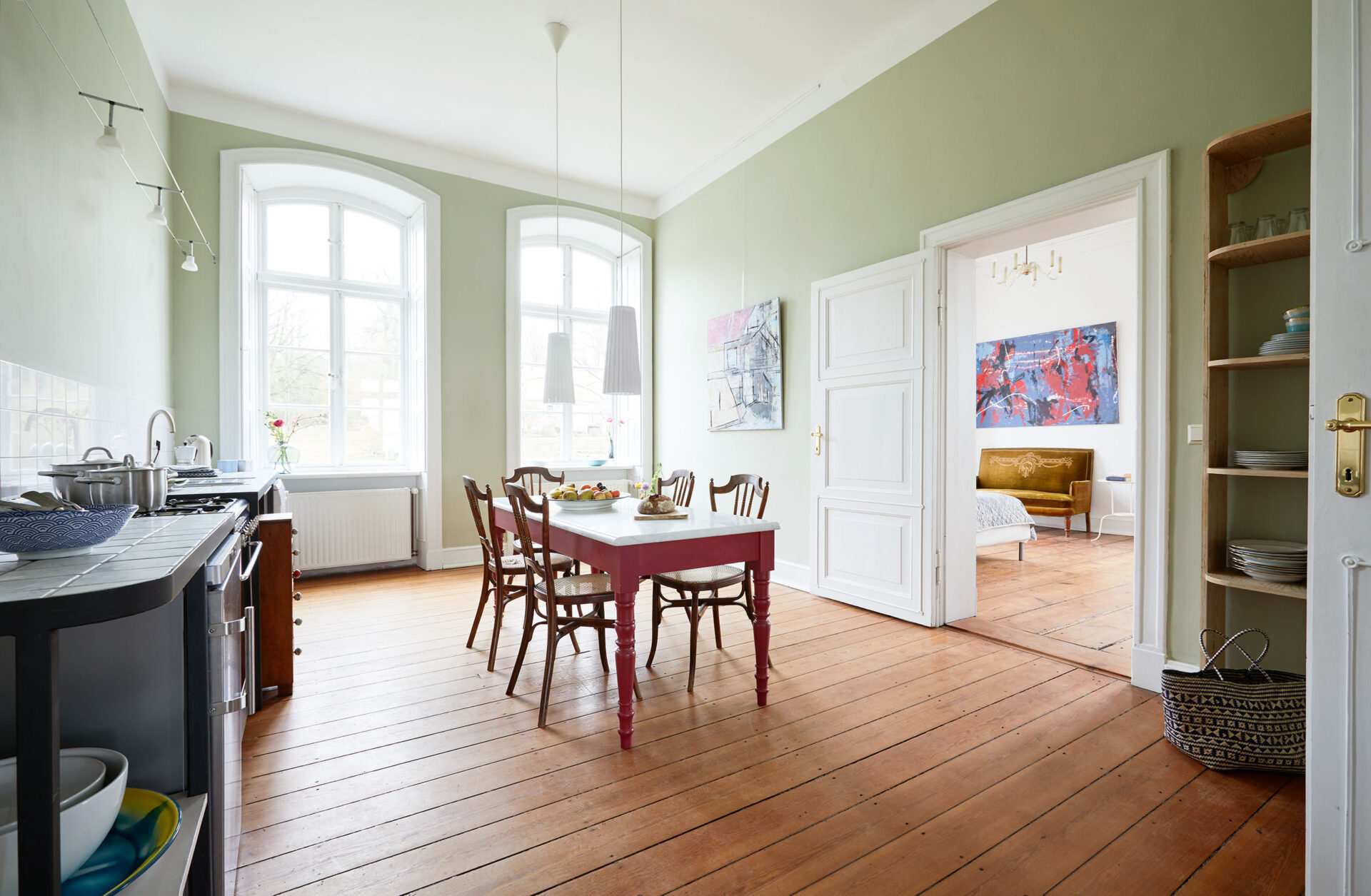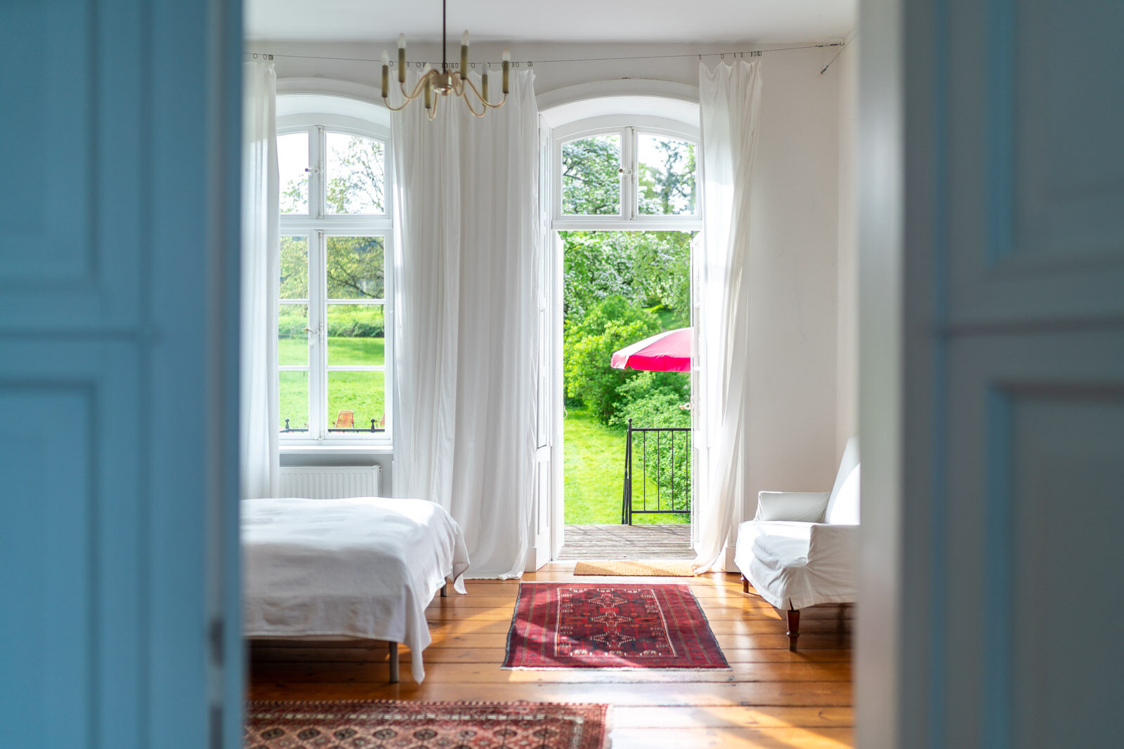 Malwida is a bright and sunny apartment in the “bel étage”. This 130 m² apartment is very spacious and stately. It consists of three approx. 30 m² large rooms which are connected by double doors. There is a chimney stove In the living room. The apartment has a well-equipped kitchen with dining table, gas stove, dishwasher and a bathroom with a large window. The 10.000 m² large manor house garden is directly accessible via a terrace.