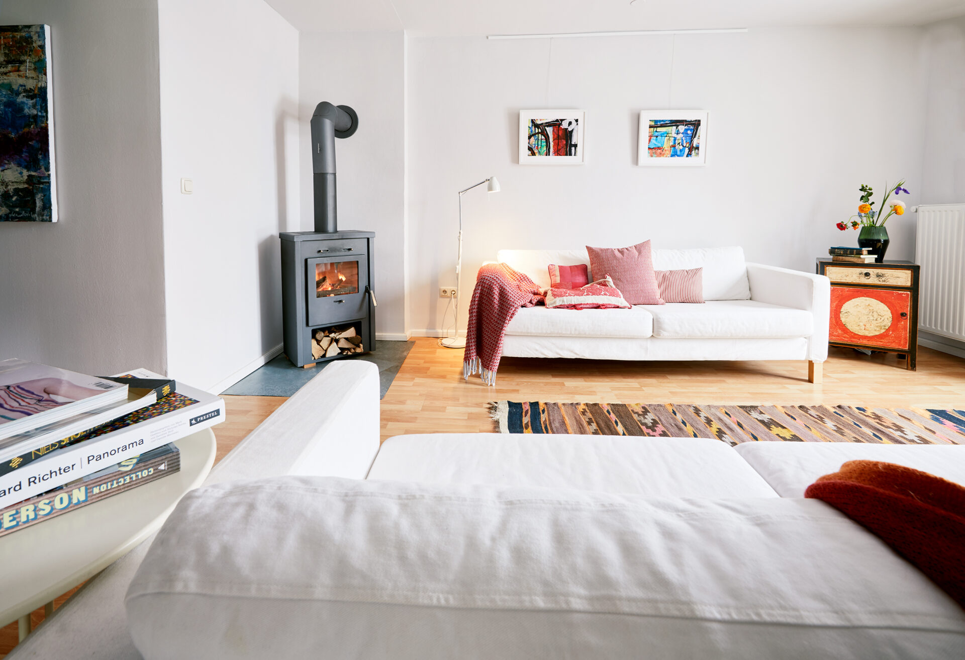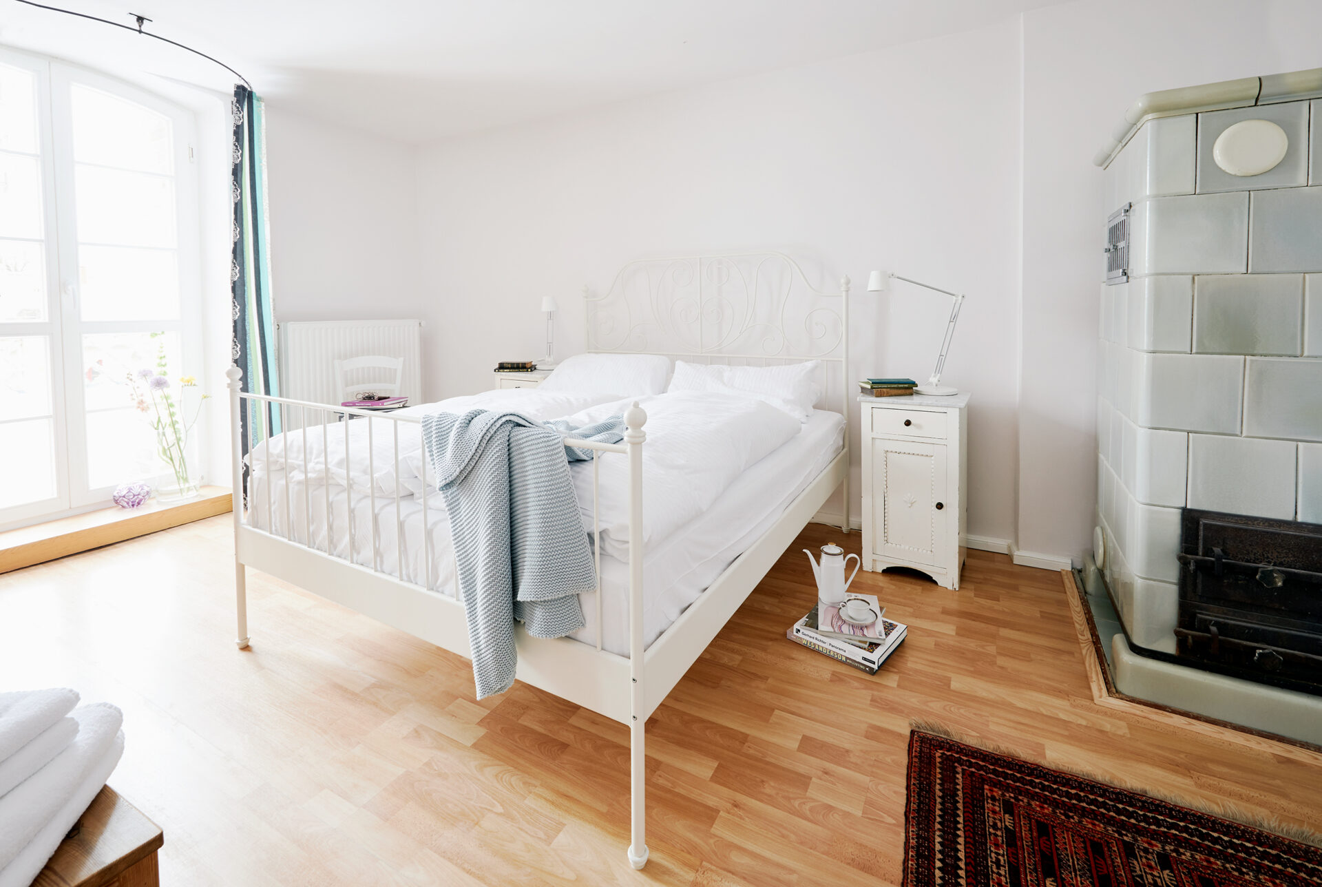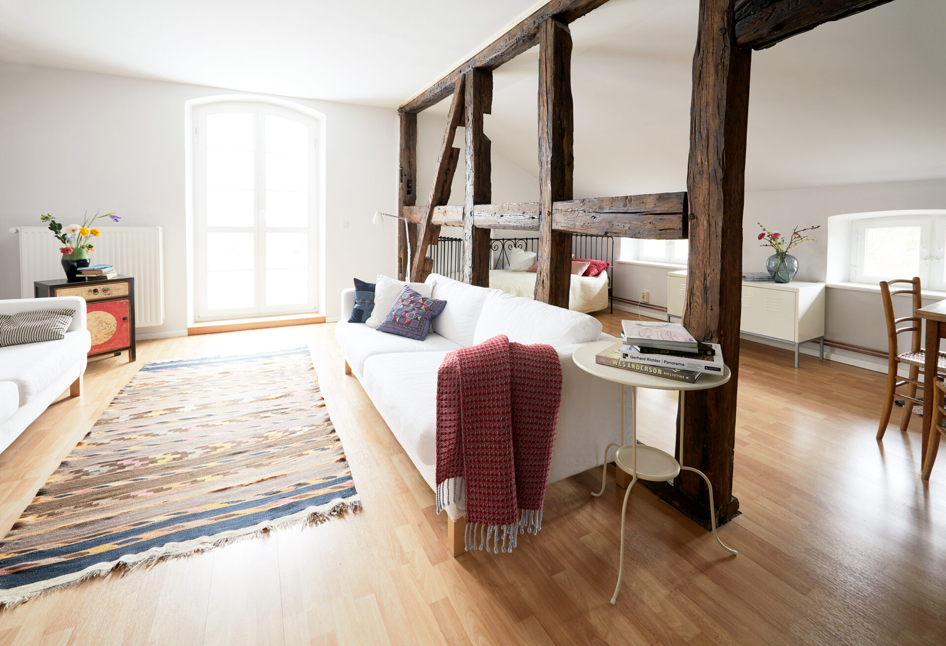 Marie is located on the first floor at the north-east gable of the manor house and has a large roof terrace. The 90 m² apartment consists of a spacious living area with open half-timbered elements. Adjoining it is a half-open kitchen a dishwasher and kitchen table. The 100 m² large roof terrace with dining area, deck chairs and wooden floor is accessible from the living room and bedroom. The bedroom with double bed leads into a smaller bedroom with two single beds.