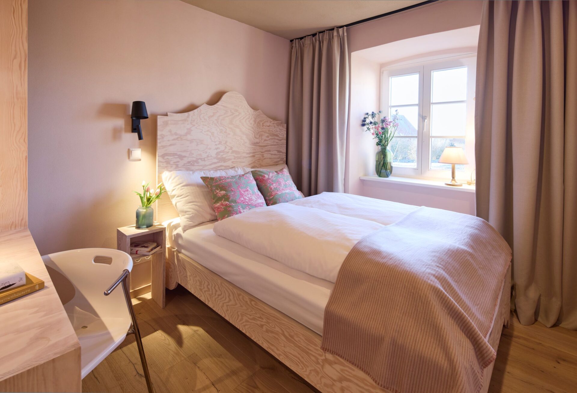 Hotelzimmer Henriette12 m² Zimmer mit 1,40m Bett, Bad en Suite, Arbeitsplatz, Fernseher und WLAN. Gang zum Ruheraum Festsaal