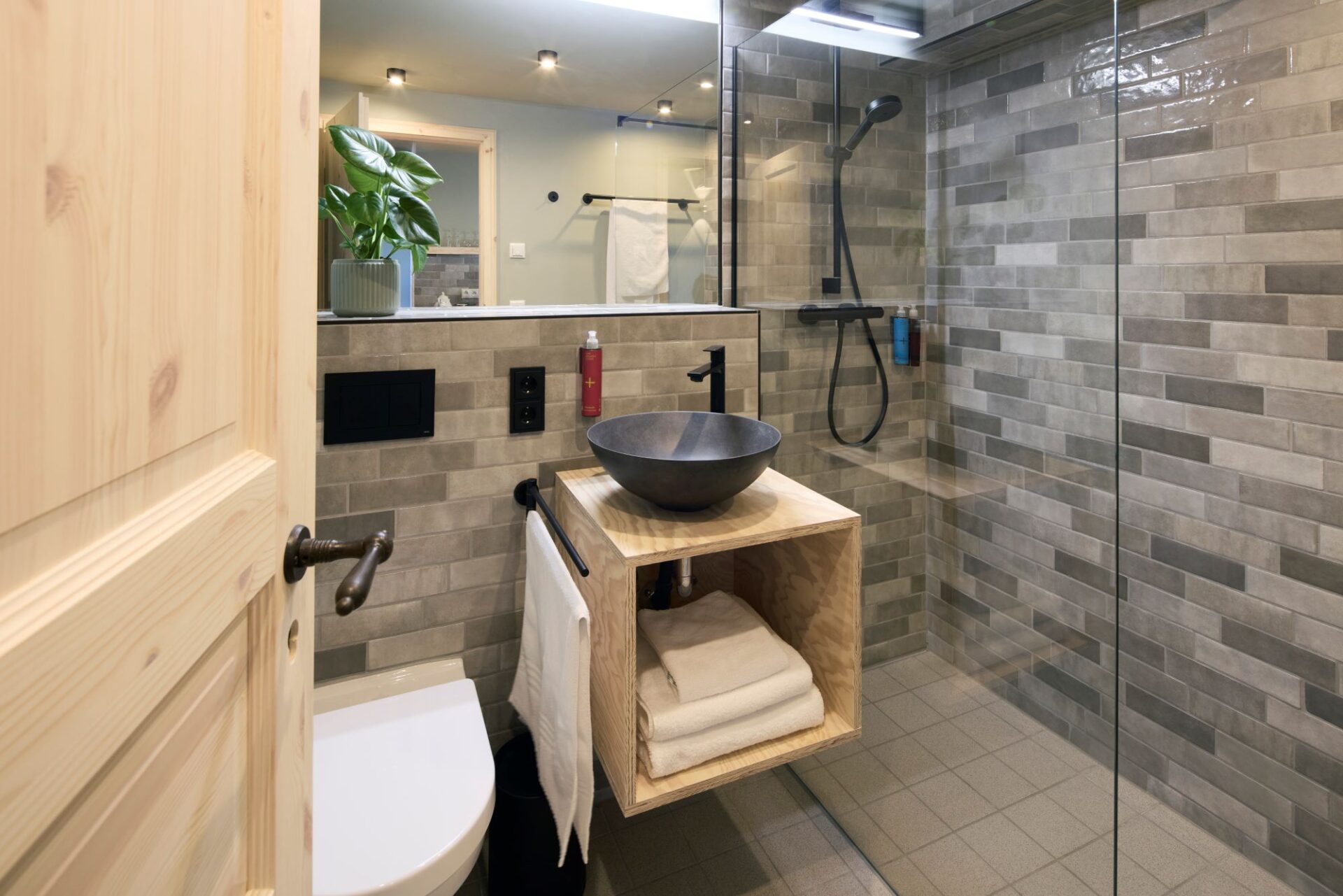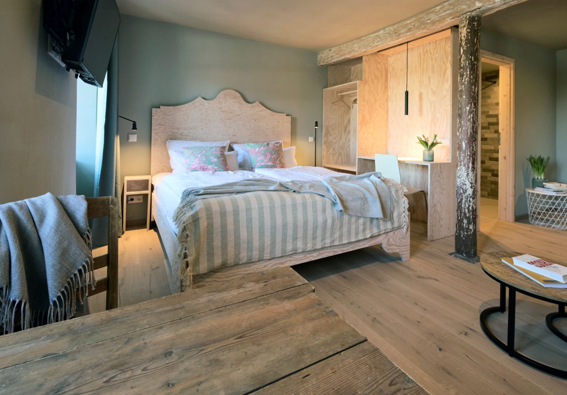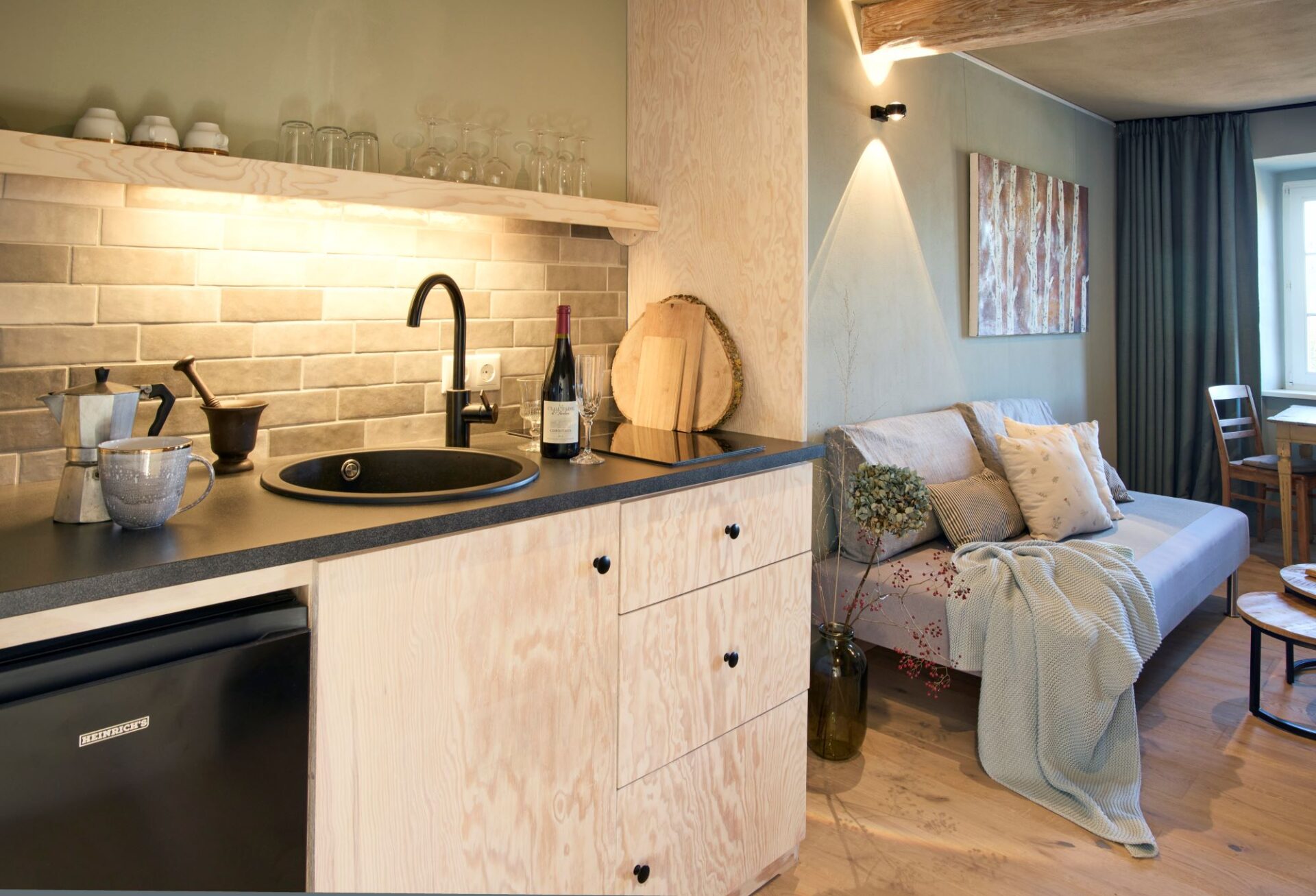 25 m² Doppelzimmer mit Lounge-Ecke und Küchenzeile für 2 Personen. Großes Doppelbett, Bad en Suite, Arbeitsplatz, Essecke, Fernseher, WLAN, Kunst.